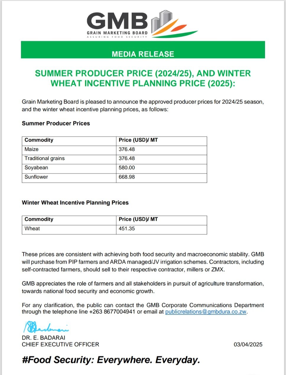 by Rawlings Kofi | Harare, April 3, 2025 – The Grain Marketing Board (GMB) has officially released the approved producer prices for the 2024/25 summer cropping season, along with the incentive planning price for winter wheat in 2025.